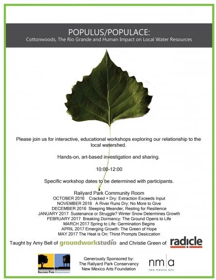 We designed and are in the midst of educational workshops with local youth from three counties exploring our Rio Grande watershed. The Rio Grande Cottonwood (Populus) and our human (populace) relationship to, use of and valuing or devaluing the watershed.